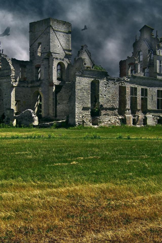 Wallpaper Crows fly over the ruins of a castle in Scotland