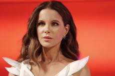 Wallpaper Actress Kate Beckinsale in a white dress on a red background