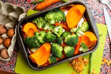 Wallpaper Fresh broccoli, carrots and pumpkin on a baking sheet