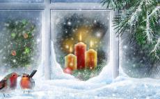 Wallpaper Birds in the window at Christmas