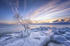 Wallpaper Beautiful view of the sea shore with stones at sunset