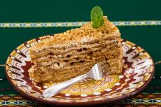Wallpaper Delicious honey cake with nuts on a beautiful plate
