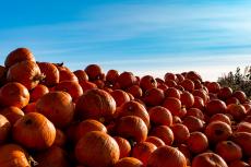 Wallpaper A lot of ripe orange pumpkin on the field against the blue sky