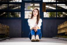 Wallpaper Beautiful asian woman in blue jeans sits on the ground