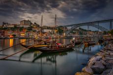 Wallpaper Boats in the port against the background of the bridge and the city at sunset