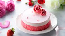Wallpaper Beautiful cake on a white plate with flowers view from above