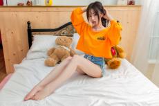 Wallpaper Asian girl on the bed with toys