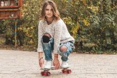 Wallpaper Girl in torn jeans on a skateboard