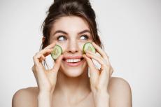 Wallpaper Blue-eyed girl applies cucumbers to her face