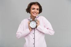 Wallpaper Smiling girl in pajamas holding an alarm clock