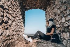 Wallpaper Girl sitting in the window of an old building