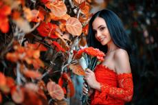 Wallpaper Smiling girl with a bouquet of carnations near the wall with autumn leaves