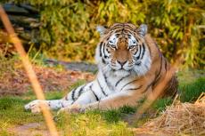 Wallpaper A harsh striped Amur tiger lies on the grass