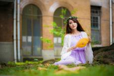 Wallpaper Little puppy sits in a basket on green grass with a pumpkin