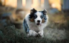Wallpaper Australian Shepherd dog with tongue hanging out running on the grass