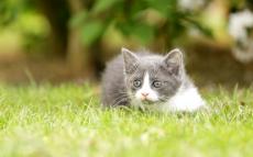 Wallpaper Little kitten lies on green grass.