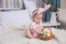 Wallpaper Little baby with a basket of Easter eggs is sitting on the bed.