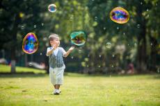 Wallpaper Little girl in a beautiful dress near a tree with pink flowers