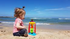 Wallpaper Little girl plays on the sand by the sea