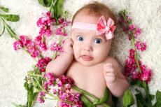 Wallpaper Little girl sitting in a white chair with a pink flower