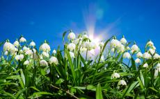 Wallpaper White snowdrops in the sun under the blue sky