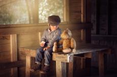 Wallpaper A little boy is sitting on a wooden table with a teddy bear