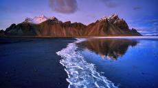 Wallpaper Water on the black sand on the background of mountains