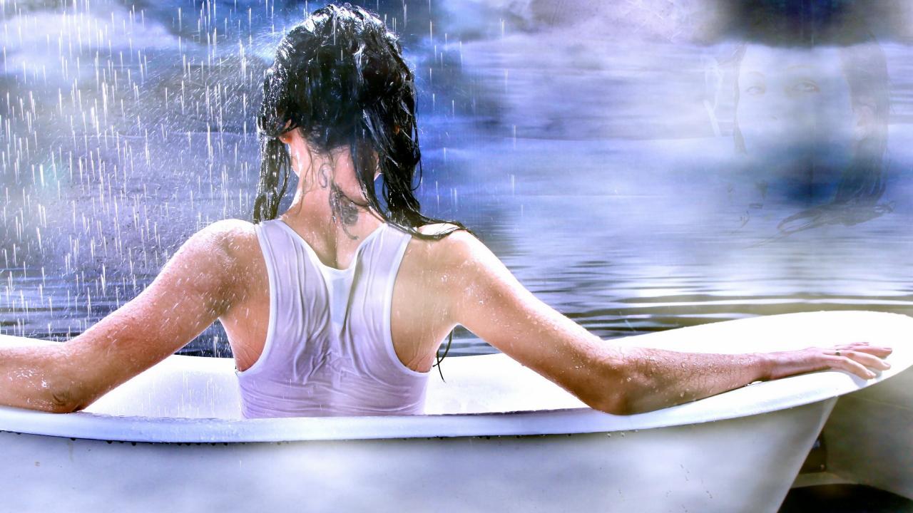 Wallpaper Girl with a tattoo on his neck sitting in the bathroom