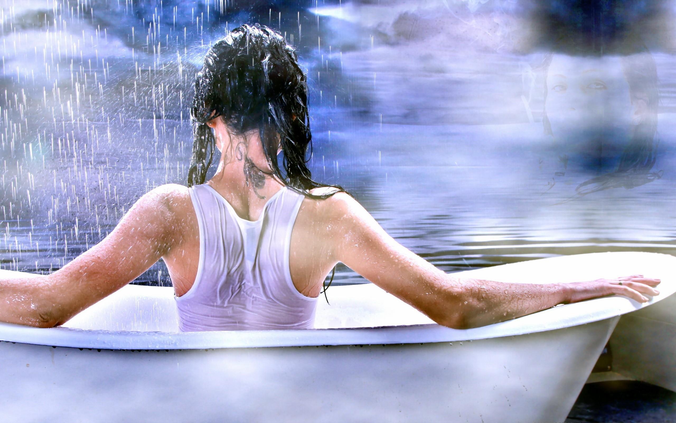Wallpaper Girl with a tattoo on his neck sitting in the bathroom