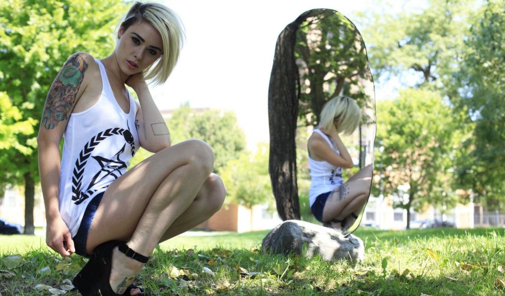 Wallpaper Girl with a tattoo on the nature of the mirror