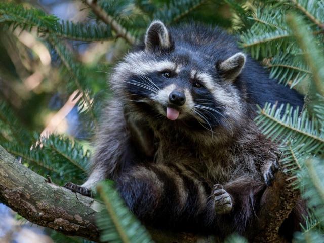 Wallpaper Raccoon sits on a pine tree