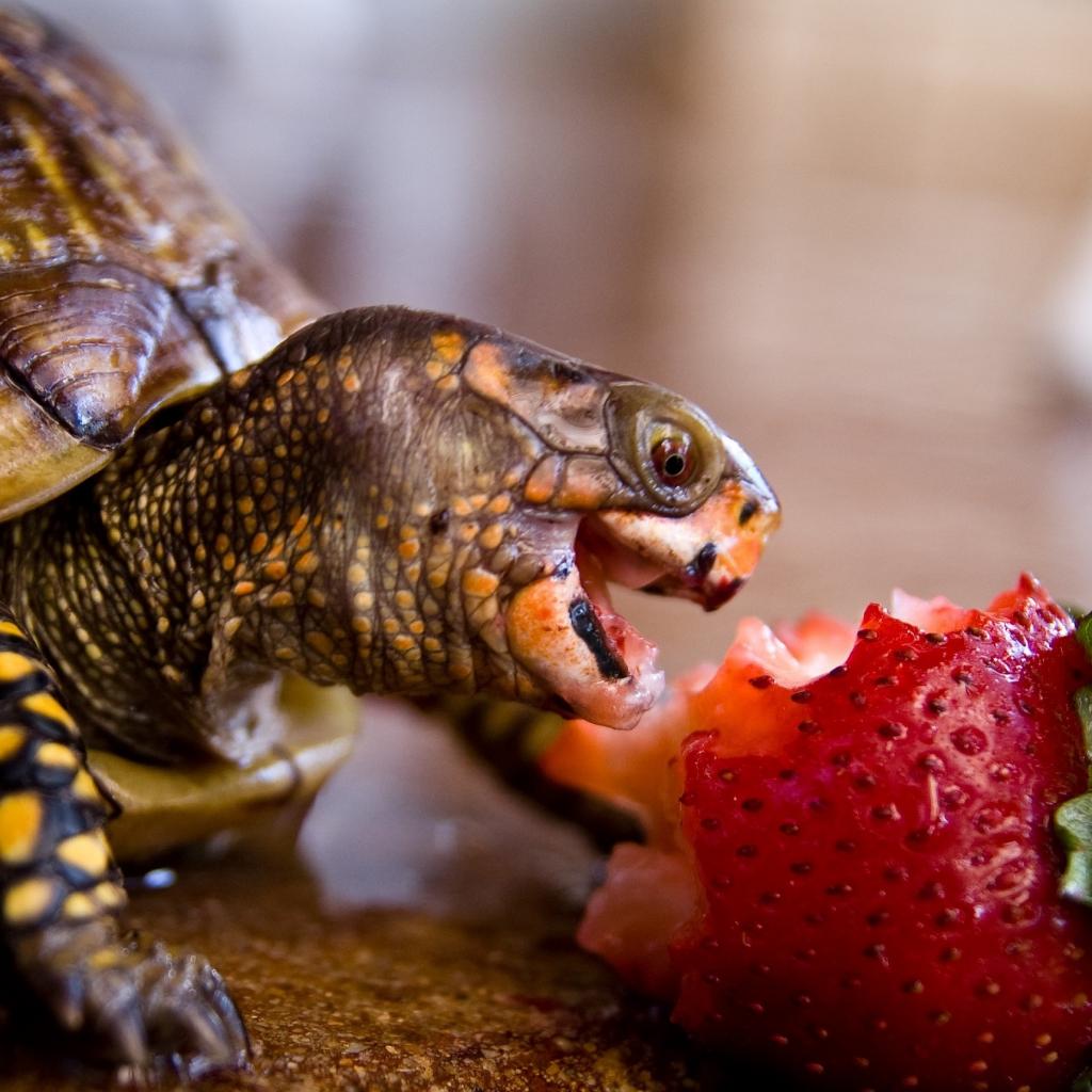 Wallpaper Turtle happy eating a strawberry