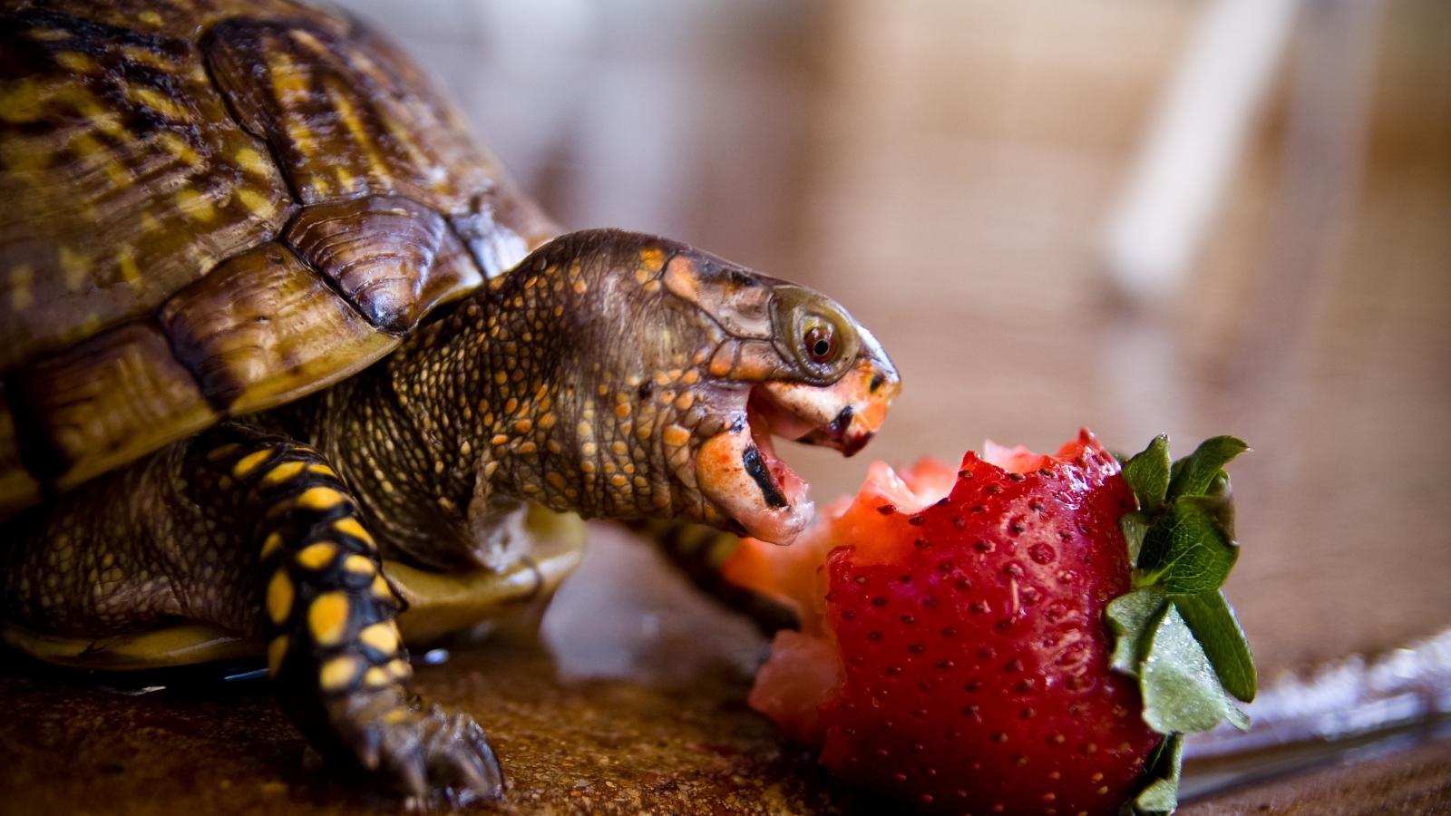 Wallpaper Turtle happy eating a strawberry