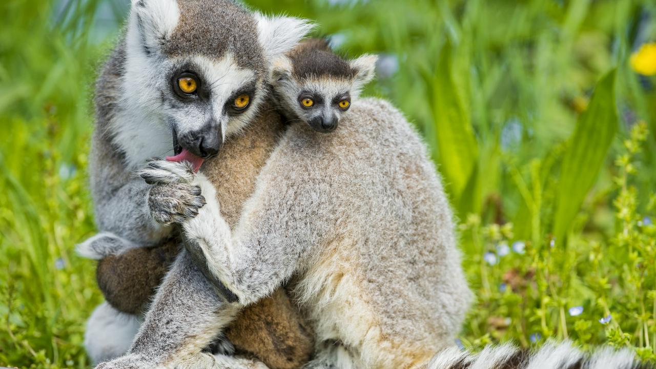Wallpaper Lemur on the neck of a giraffe, cartoon