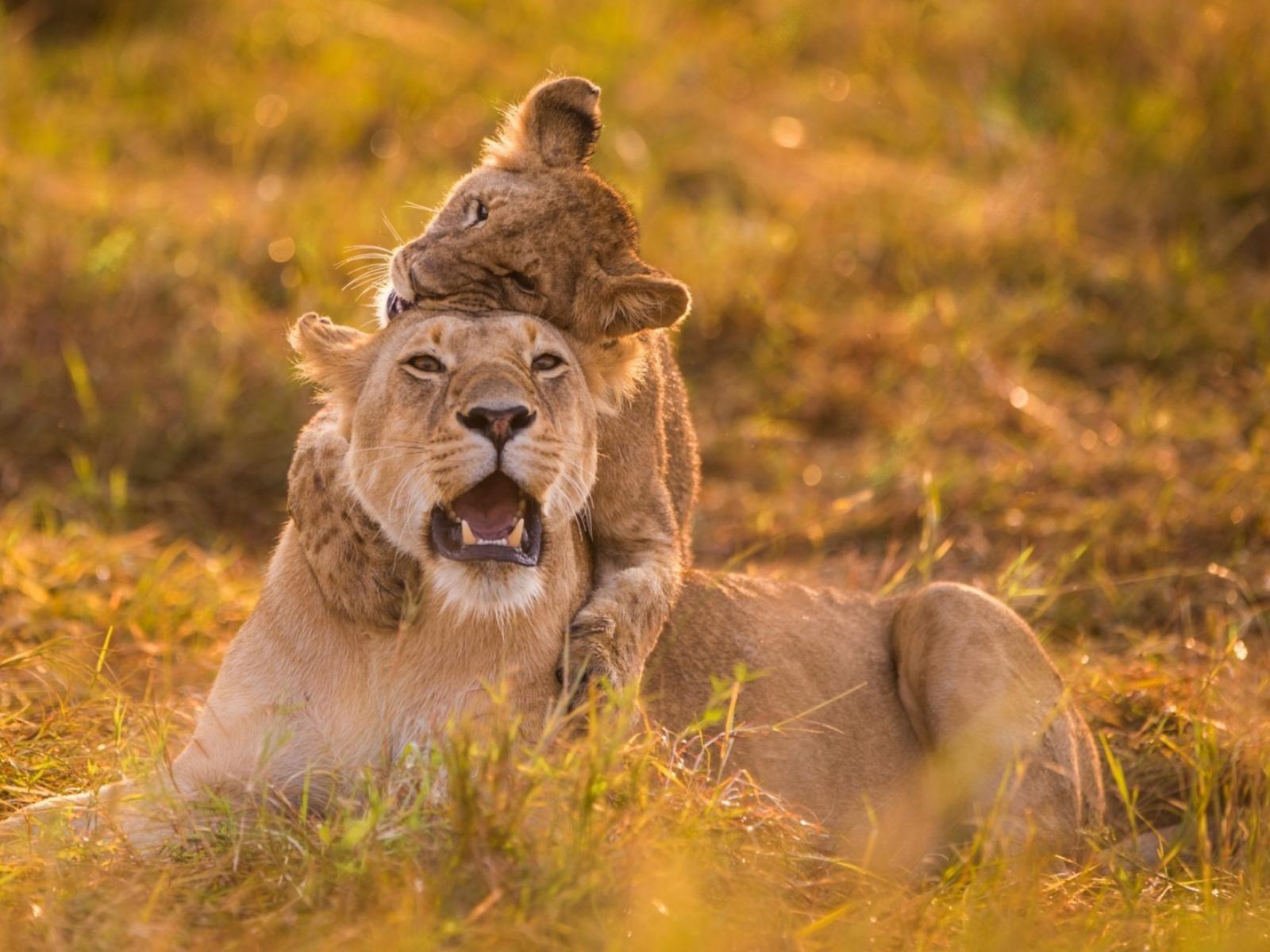Wallpaper Lioness and cub in the grass