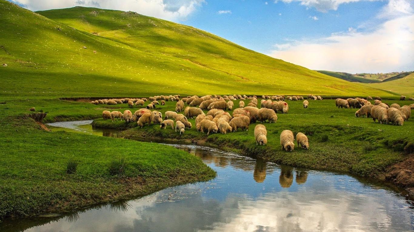 » Wallpaper Sheep on a pasture at the river
