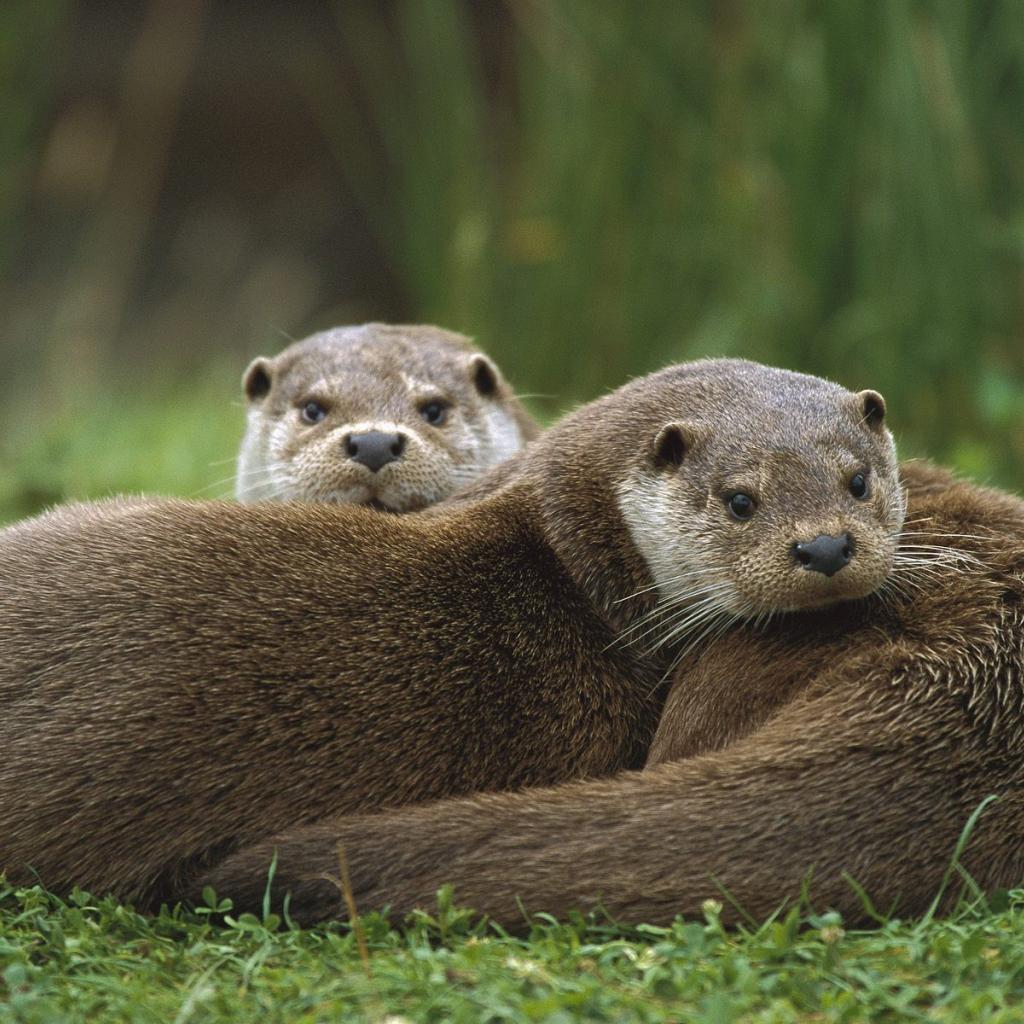 Wallpaper Two otters lie on the grass