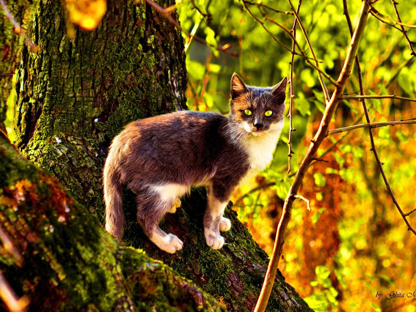 Wallpaper Cat on a tree covered with moss