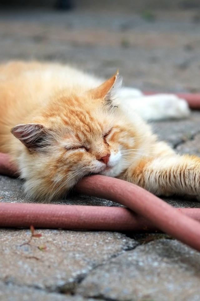 Wallpaper Red cat sleeping on the hose