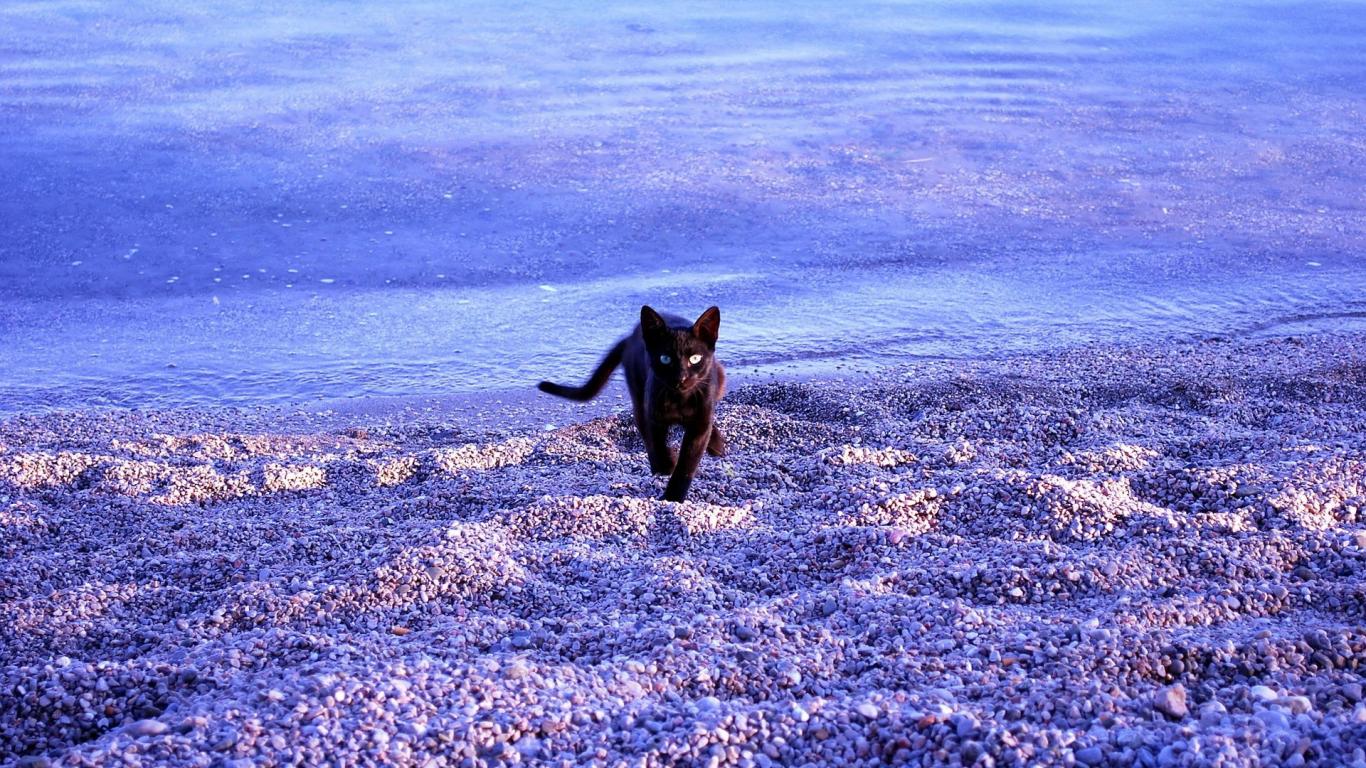 Wallpaper A black cat ran over the pebbles on the beach