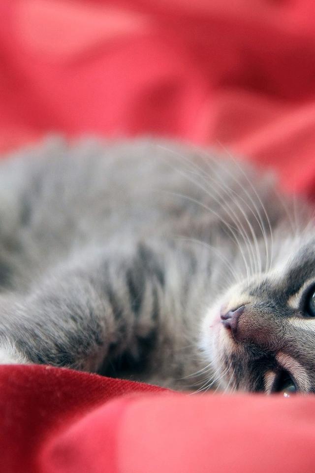 Wallpaper Gray kitten lying on red fabric