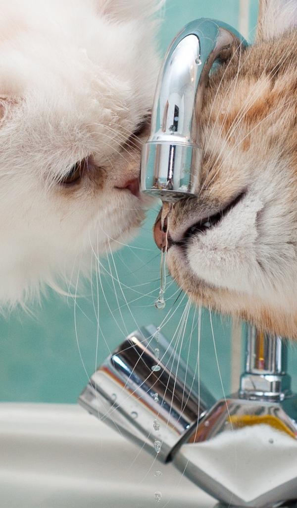 Wallpaper Two cats drink water from the tap