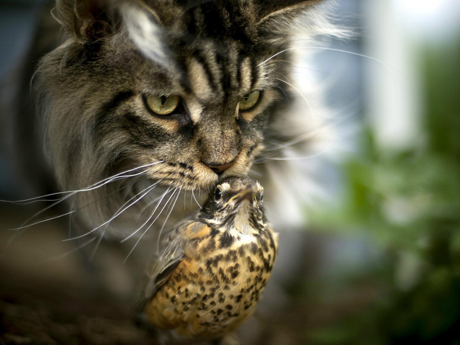 Wallpaper Unusual friendship of a cat and a bird