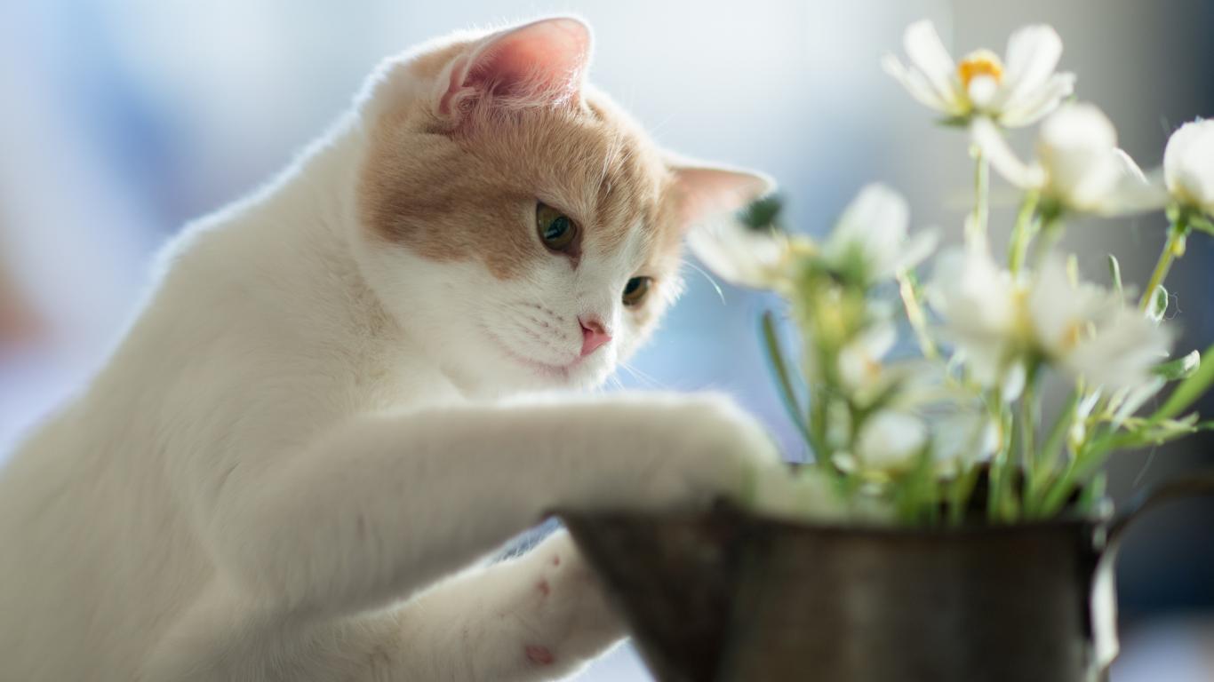 Wallpaper Kitten plays with flowers