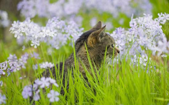 Wallpaper Grey cat in the flowers