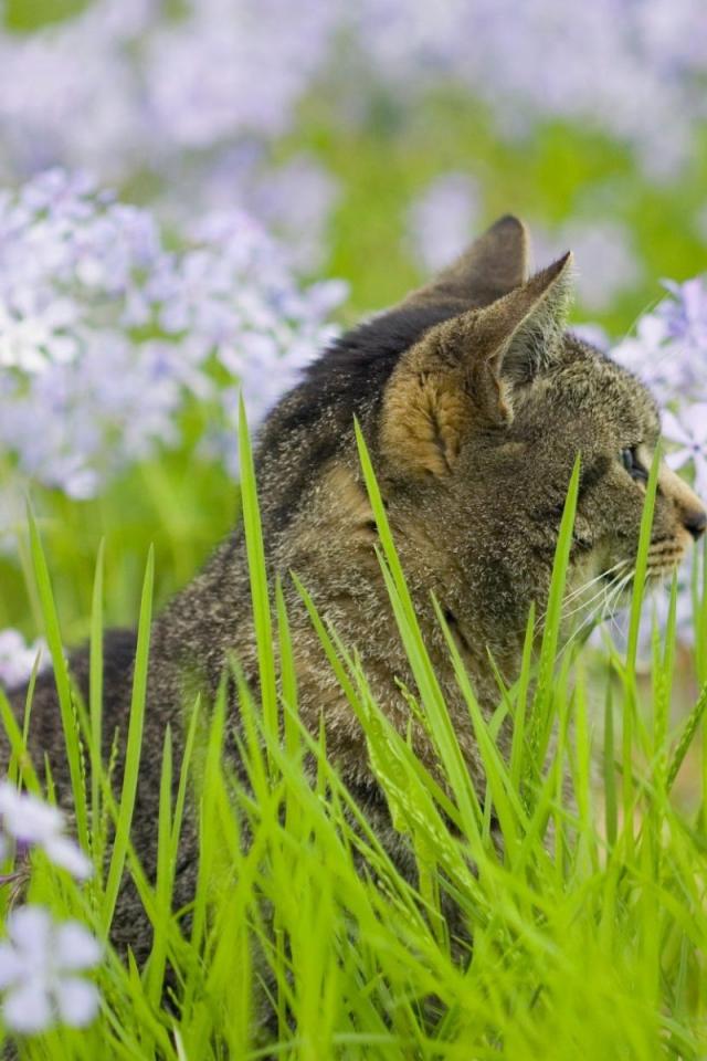 Wallpaper Grey cat in the flowers