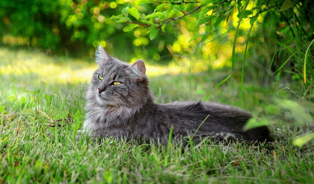 Wallpaper Grey cat lying in the grass