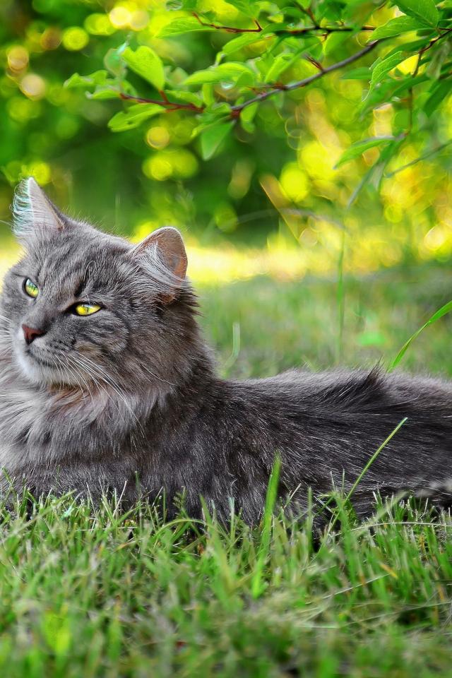 Wallpaper Grey cat lying in the grass