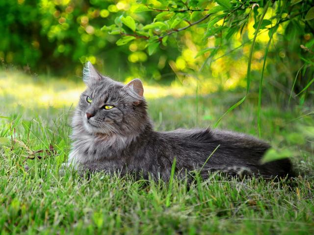 Wallpaper Grey cat lying in the grass