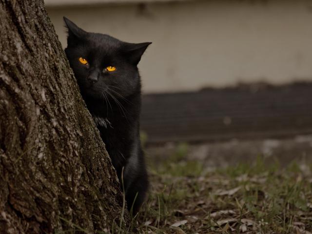 Wallpaper Black cat behind the tree